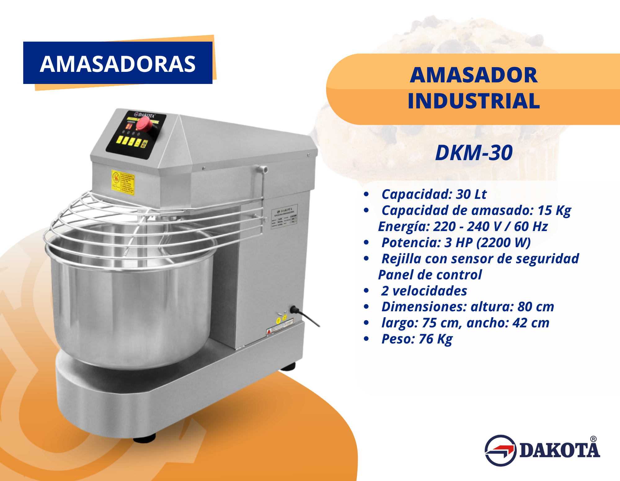 La amasadora industrial de 30 litros es ideal para panaderías, pastelerías y negocios de alimentos que necesitan preparar grandes volúmenes de masa con rapidez y eficiencia. Equipada con rejilla de seguridad y panel de control con 2 velocidades, ofrece un funcionamiento potente y seguro.