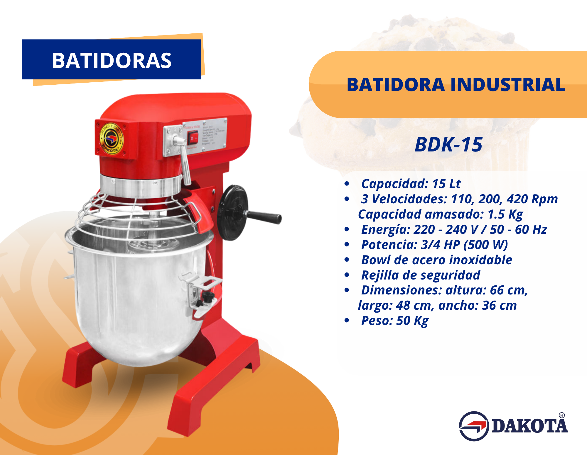 La batidora amasadora industrial DK-B15 ofrece mayor capacidad y potencia para negocios de panadería, pastelería o gastronomía profesional. Su bowl de acero inoxidable de 15 litros y sus 3 velocidades regulables garantizan un mezclado uniforme y eficiente.