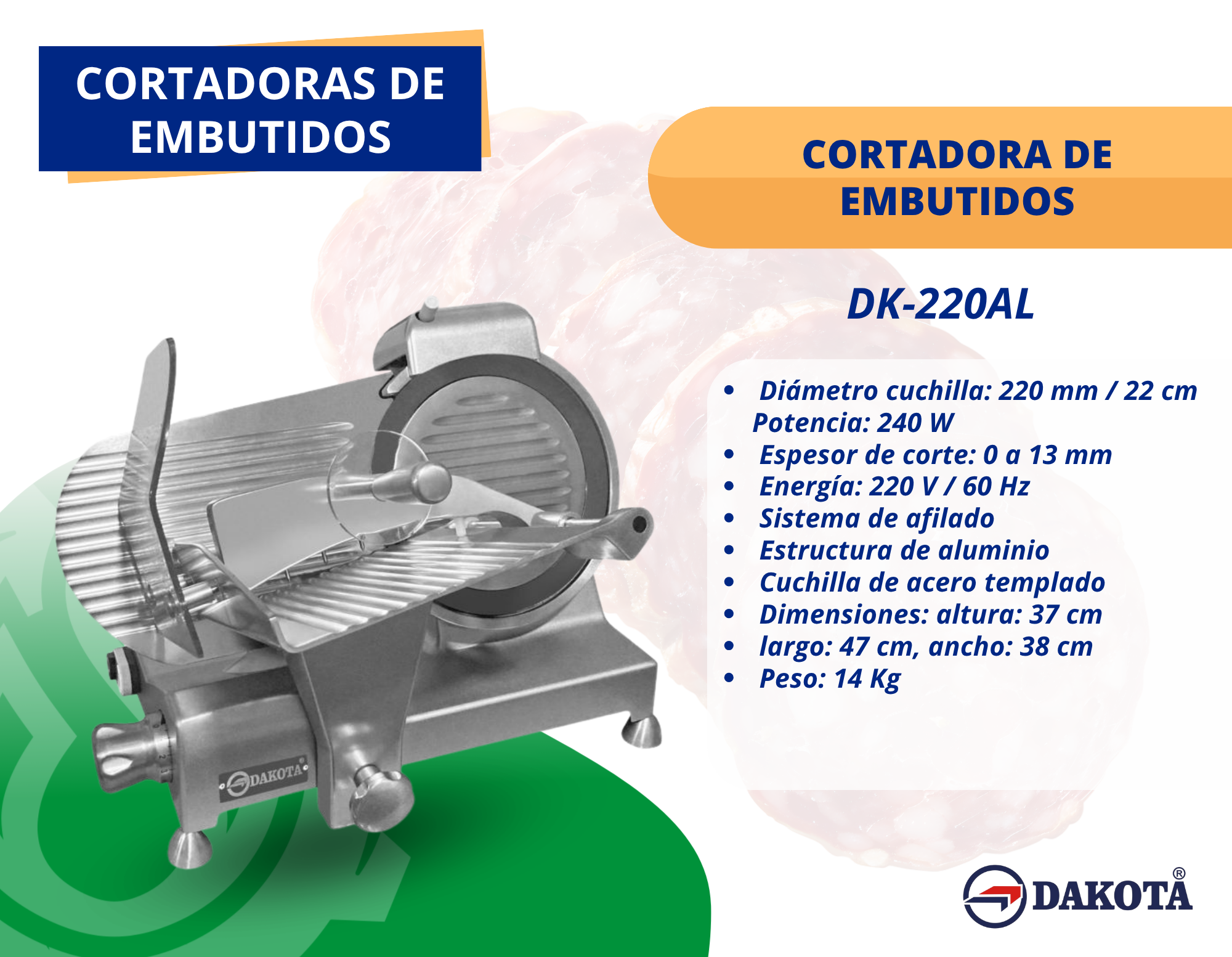 La cortadora de embutidos DK-220AL combina precisión, potencia y durabilidad para un corte uniforme en fiambres, carnes y quesos. Incorpora una cuchilla de acero templado de 220 mm, con ajuste de espesor de 0 a 13 mm y sistema de afilado integrado para mantener un rendimiento constante. Su motor de 240W y estructura de aluminio resistente aseguran un funcionamiento eficiente y silencioso. Con dimensiones de 37 x 47 x 38 cm y peso de 14 kg, es ideal para restaurantes, charcuterías y negocios de alimentos.