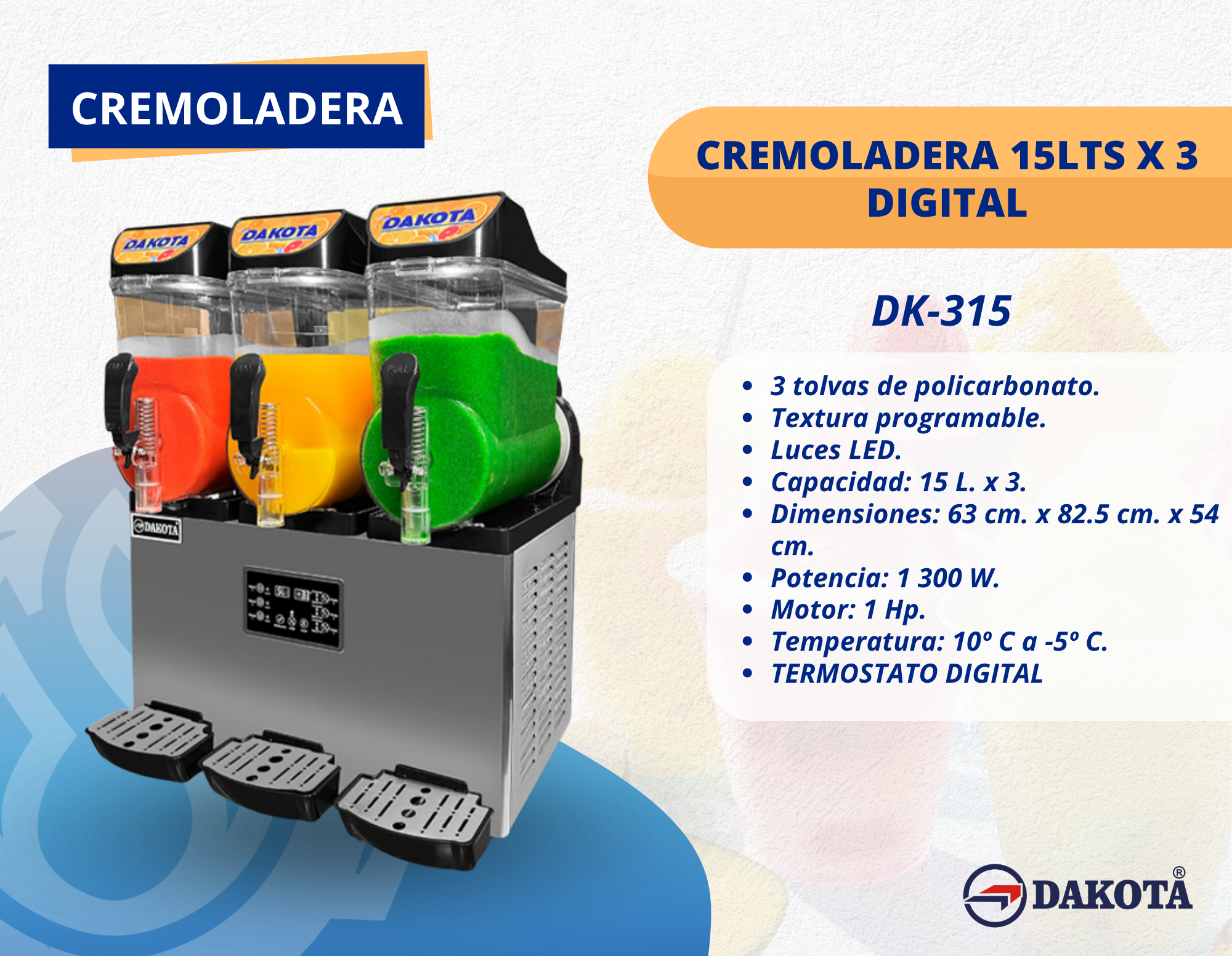 La cremoladera digital de 15 litros x 3 tolvas ofrece máximo rendimiento y control preciso para preparar cremoladas, jugos fríos y bebidas granizadas. Cuenta con 3 tolvas de policarbonato resistente, textura programable, luces LED y termostato digital que permite ajustar la temperatura entre 10°C y -5°C. Con potencia de 1300W, motor de 1 HP y medidas de 63 x 82.5 x 54 cm, es ideal para cafeterías, heladerías y negocios de bebidas.