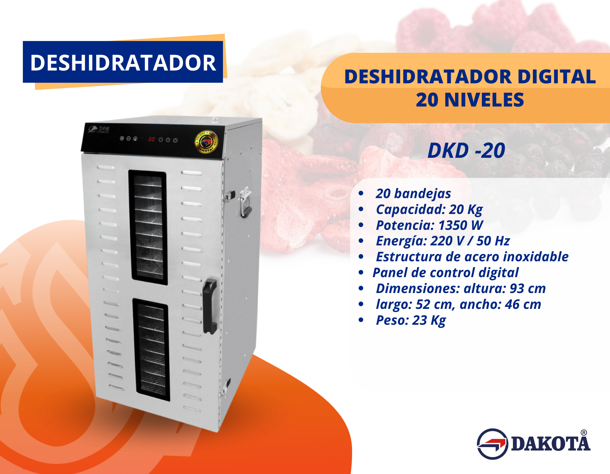El Deshidratador Digital 20 Niveles DKD-20 es ideal para deshidratar frutas, verduras, carnes y hierbas de manera rápida y uniforme. Con 20 bandejas y capacidad de 20 kg, permite una producción eficiente para emprendimientos, negocios gastronómicos y uso profesional. Su potencia de 1350 W, junto al panel de control digital, garantiza un secado preciso y controlado. Fabricado en acero inoxidable, ofrece durabilidad, higiene y fácil limpieza.