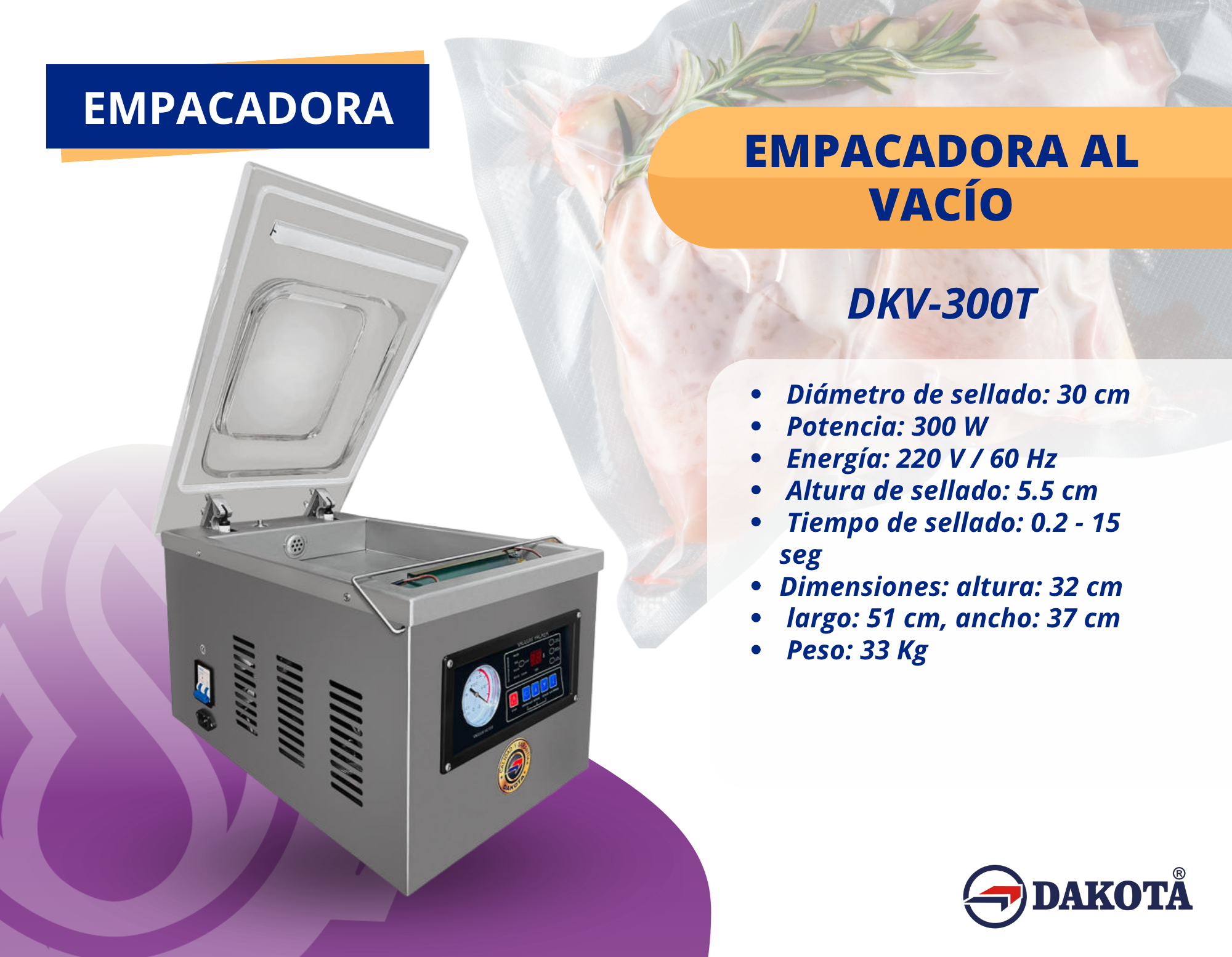 La Empacadora al Vacío DKV-300T es una máquina de envasado profesional diseñada para garantizar un sellado firme y prolongar la vida útil de alimentos y productos. Con un diámetro de sellado de 30 cm y una altura de sellado de 5.5 cm, permite trabajar con bolsas más grandes y de mayor volumen. Su potencia de 300 W, tiempo de sellado regulable entre 0.2 y 15 segundos y operación a 220 V / 60 Hz aseguran un desempeño eficiente y estable.