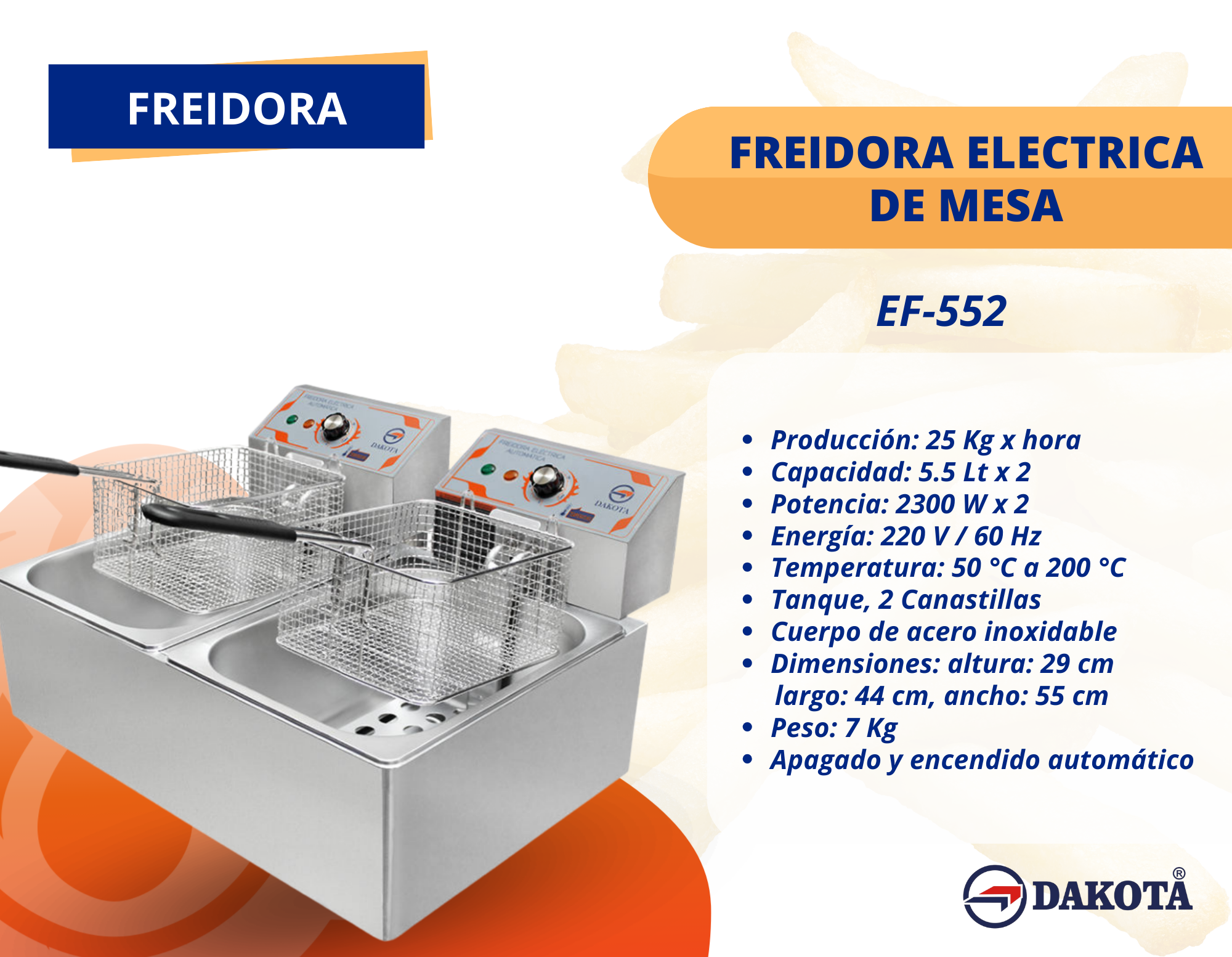 La Freidora Eléctrica de Mesa EF-552 es la solución ideal para negocios gastronómicos que requieren una fritura rápida, uniforme y de alta producción. Con dos tanques de 5.5 litros y una capacidad de 25 kg por hora, ofrece un rendimiento profesional. Su doble potencia de 2300 W x 2 permite alcanzar temperaturas entre 50 °C y 200 °C, garantizando resultados crujientes y consistentes. Fabricada en acero inoxidable, es resistente, higiénica y fácil de limpiar. Incluye dos canastillas, control automático de encendido/apagado y un diseño compacto perfecto para cocinas de restaurantes, cafeterías y fast food.