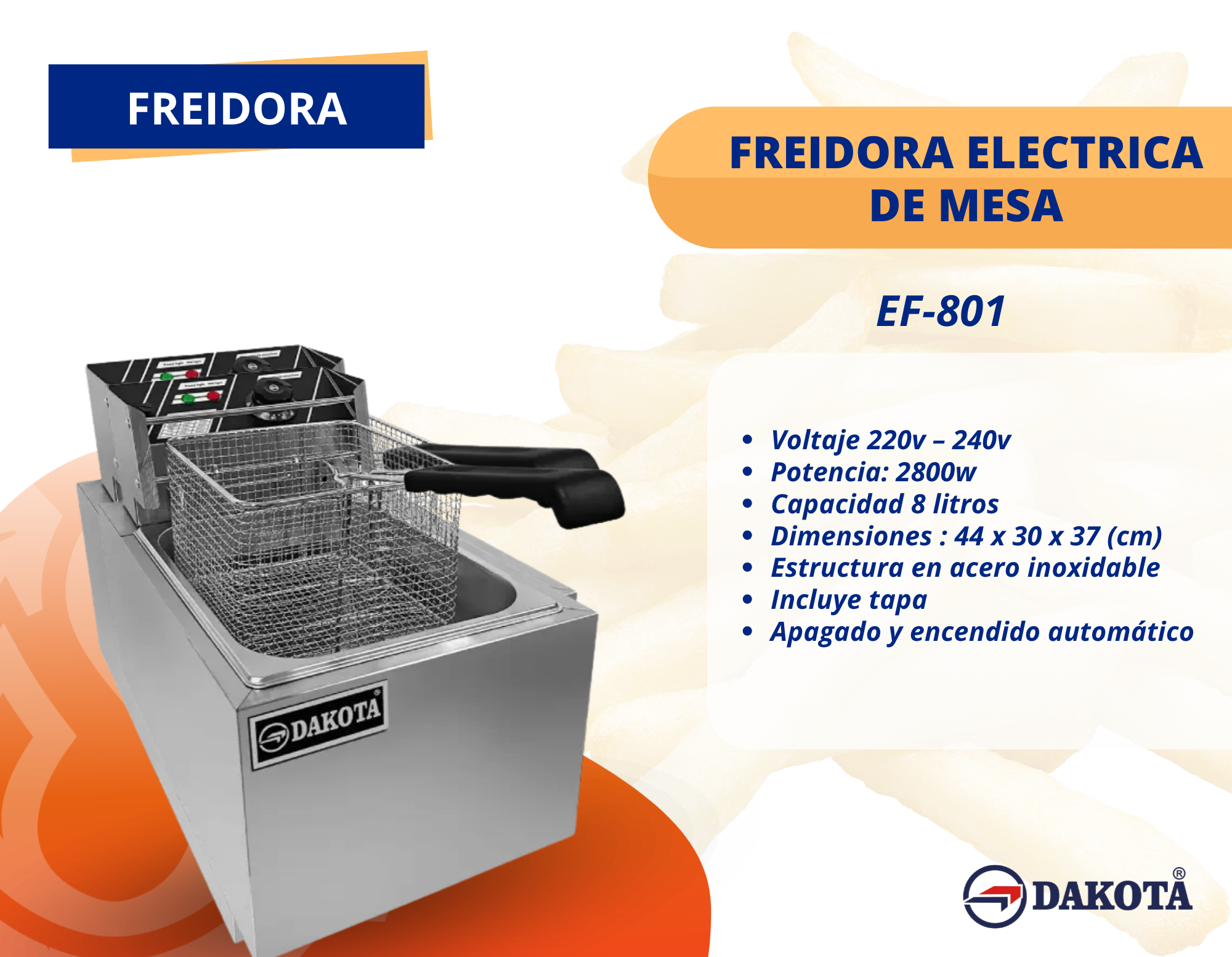 La Freidora Eléctrica de Mesa EF-801 ofrece una capacidad de 8 litros y una potencia de 2800W, ideal para restaurantes, food trucks o uso doméstico. Fabricada en acero inoxidable, cuenta con encendido automático, tapa incluida y funcionamiento a 220–240V, garantizando durabilidad y cocción uniforme.