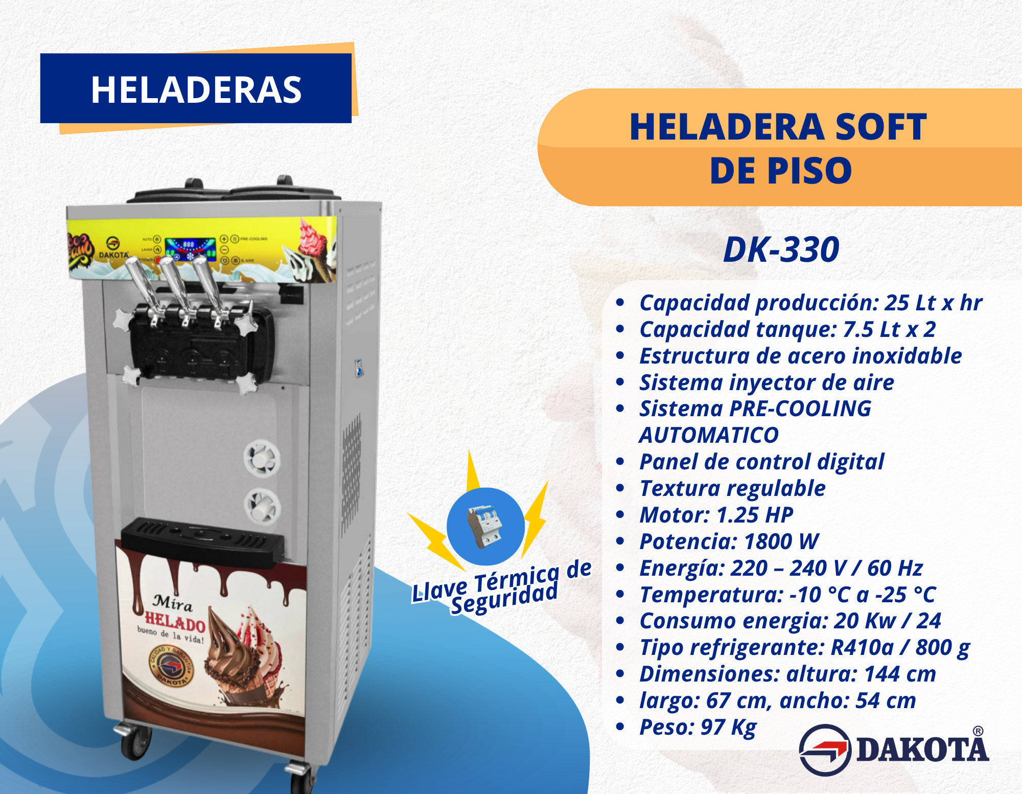 La máquina para helados soft profesional ofrece alta capacidad y eficiencia, ideal para negocios que buscan calidad y rendimiento. Produce hasta 25 litros por hora con dos tanques de 7.5 litros y una estructura de acero inoxidable que garantiza resistencia e higiene.