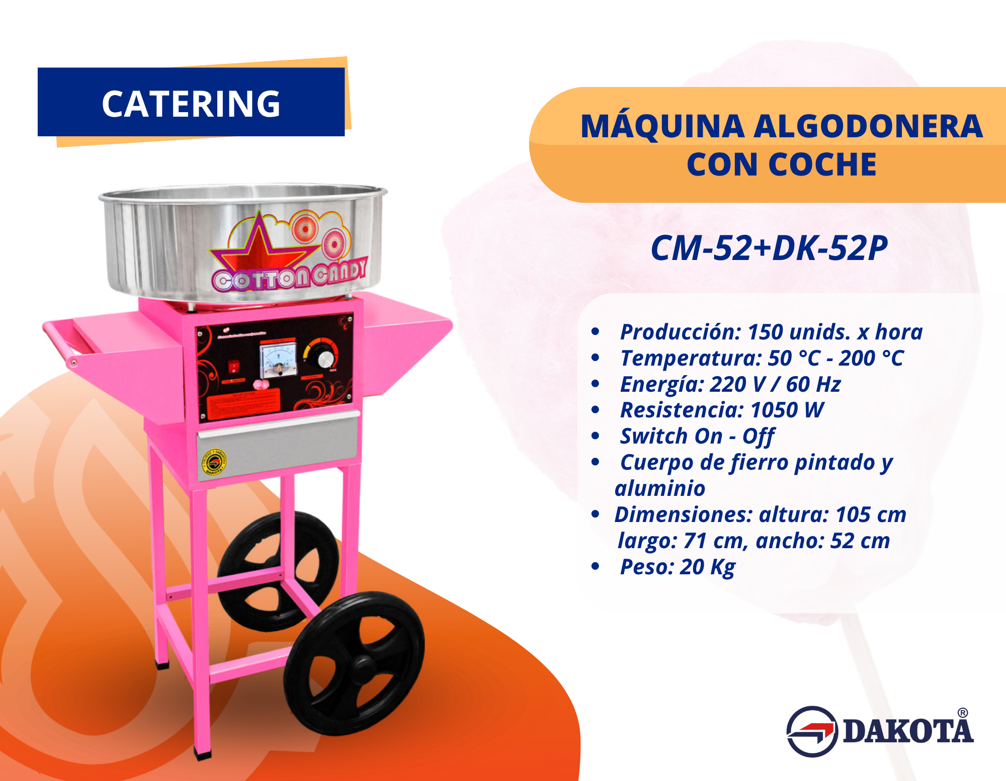 La Máquina Algodonera con Coche CM-52+DK-52P es ideal para eventos, ferias y negocios de snacks. Con una producción de hasta 150 unidades por hora, permite elaborar algodón de azúcar de manera rápida y uniforme. Funciona con energía de 220 V, cuenta con resistencia de 1050 W y temperatura regulable de 50 °C a 200 °C. Su estructura de fierro pintado y aluminio garantiza durabilidad y fácil limpieza, mientras que su carro con ruedas facilita el traslado.