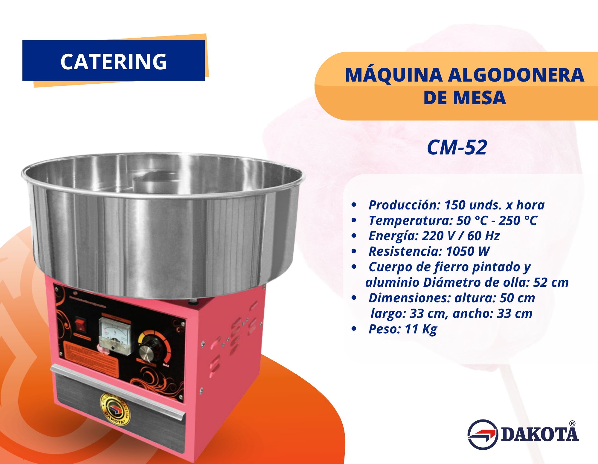 La Máquina Algodonera de Mesa CM-52 es perfecta para negocios, ferias y eventos que buscan preparar algodón de azúcar de forma rápida y eficiente. Con una producción de hasta 150 unidades por hora, trabaja a una temperatura regulable entre 50 °C y 250 °C. Su estructura de fierro pintado y aluminio ofrece resistencia y durabilidad, mientras que su olla de 52 cm de diámetro permite una preparación uniforme. Compacta y práctica, es ideal para emprendimientos o uso comercial.