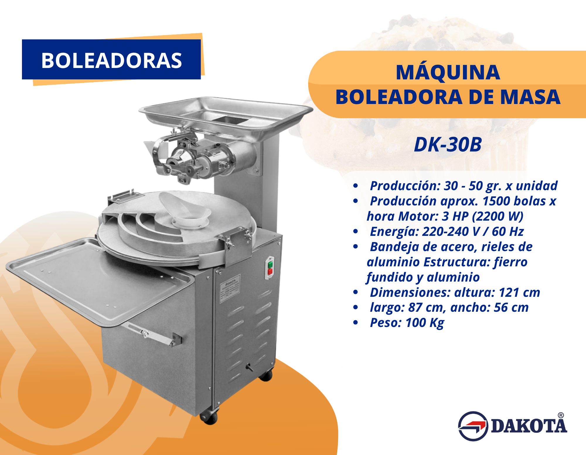 La máquina boleadora de masa DK-30B es ideal para panaderías, pastelerías y negocios de alimentos, optimizando la producción y garantizando bolas de masa uniformes y consistentes. Su estructura robusta y motor potente permiten un rendimiento profesional y continuo.