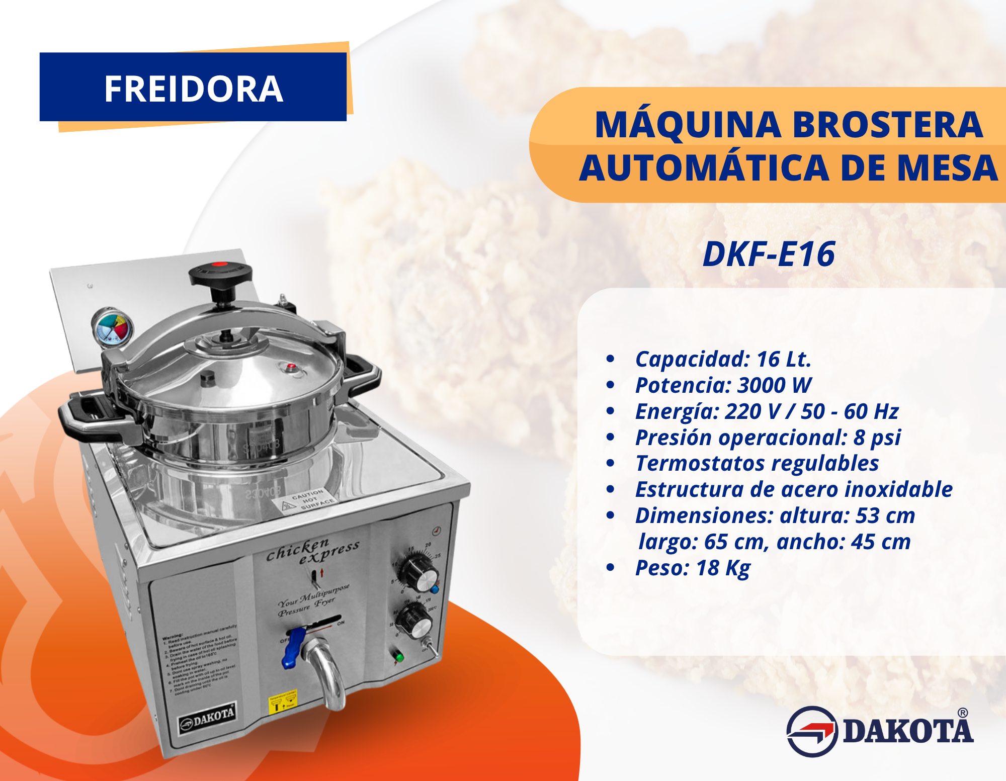 La máquina brostera automática de mesa de 16 litros es ideal para restaurantes, pollerías y negocios de comida rápida. Con potencia de 3000W y energía de 220V / 50-60Hz, ofrece un fritado uniforme y rápido. Su presión operacional de 8 psi y termostatos regulables garantizan un control preciso de la cocción. Fabricada en acero inoxidable, brinda durabilidad, fácil limpieza y un diseño compacto. Con dimensiones de 53x65x45 cm y peso de 18 kg, esta brostera eléctrica automática de mesa combina potencia, seguridad y eficiencia.