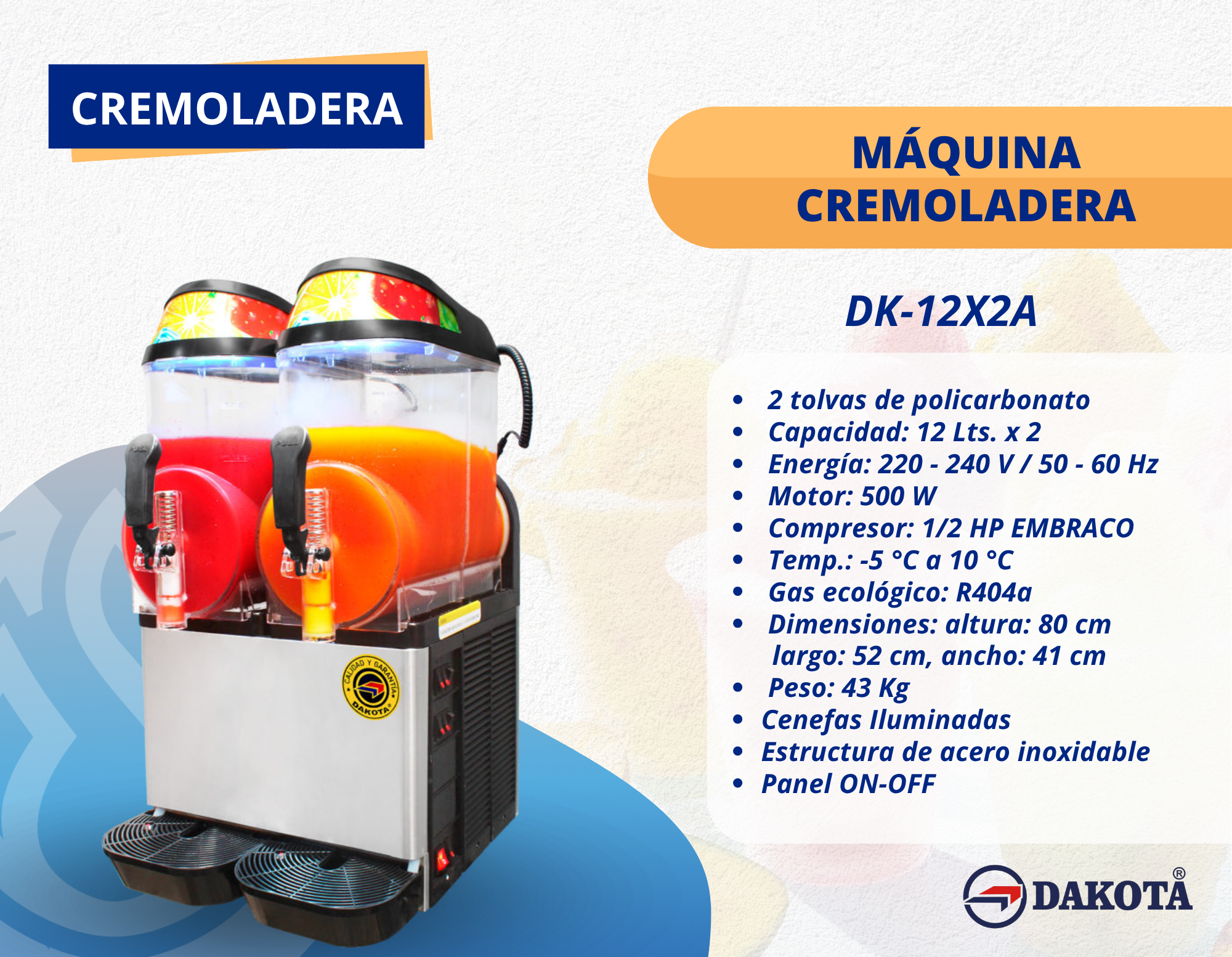 Ideal para negocios de bebidas frías, esta granizadora profesional cuenta con 2 tolvas de policarbonato de 12 litros cada una, resistentes y transparentes para una mejor exhibición del producto. Su compresor EMBRACO de 1/2 HP y el gas ecológico R404a permiten un enfriamiento rápido y uniforme, alcanzando temperaturas de -5 °C a 10 °C.
