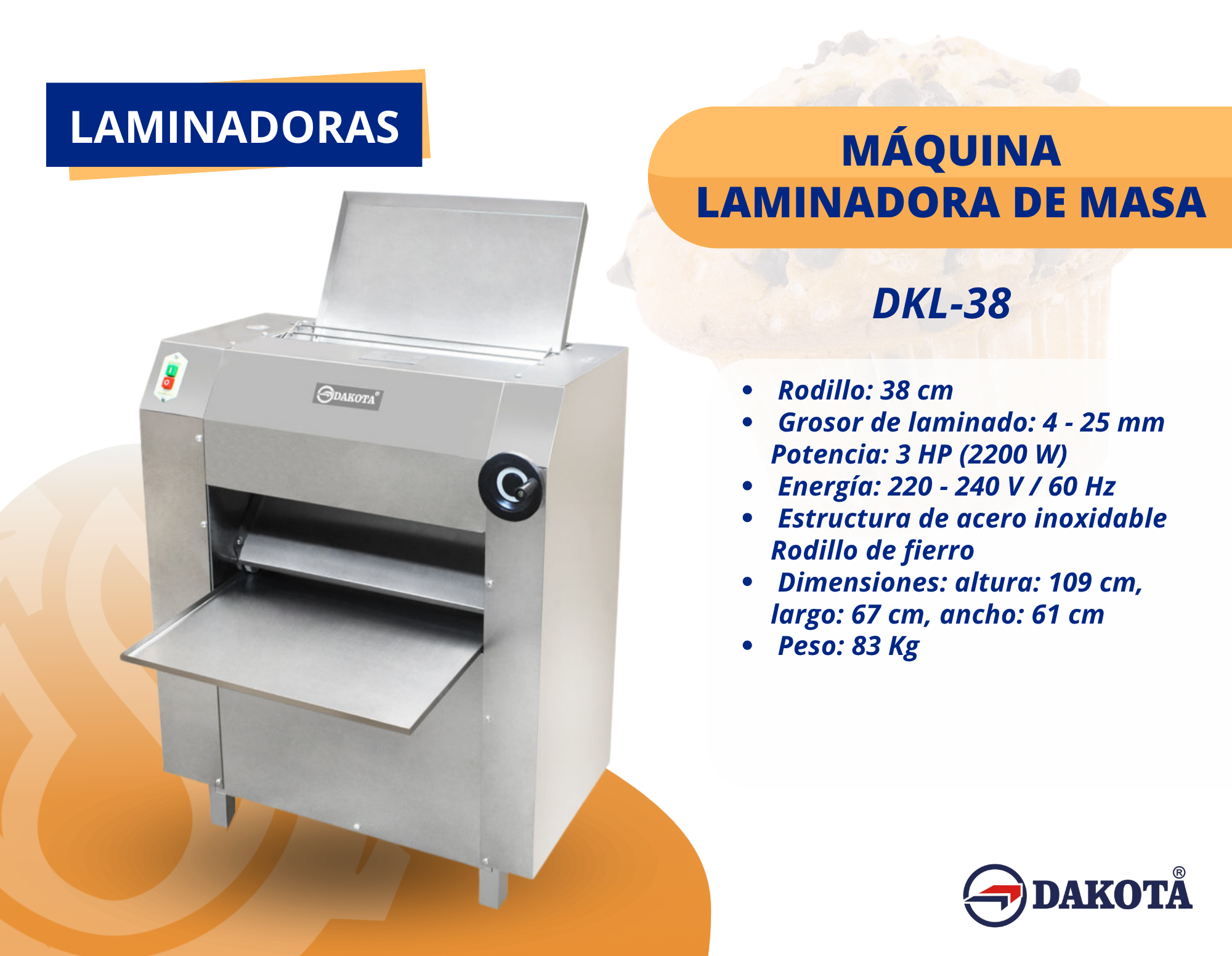 Etiquetas: laminadora de acero inoxidable, laminadora de masa, laminadora eléctrica DK-38R, laminadora industrial, laminadora panadería, máquina laminadora de masa