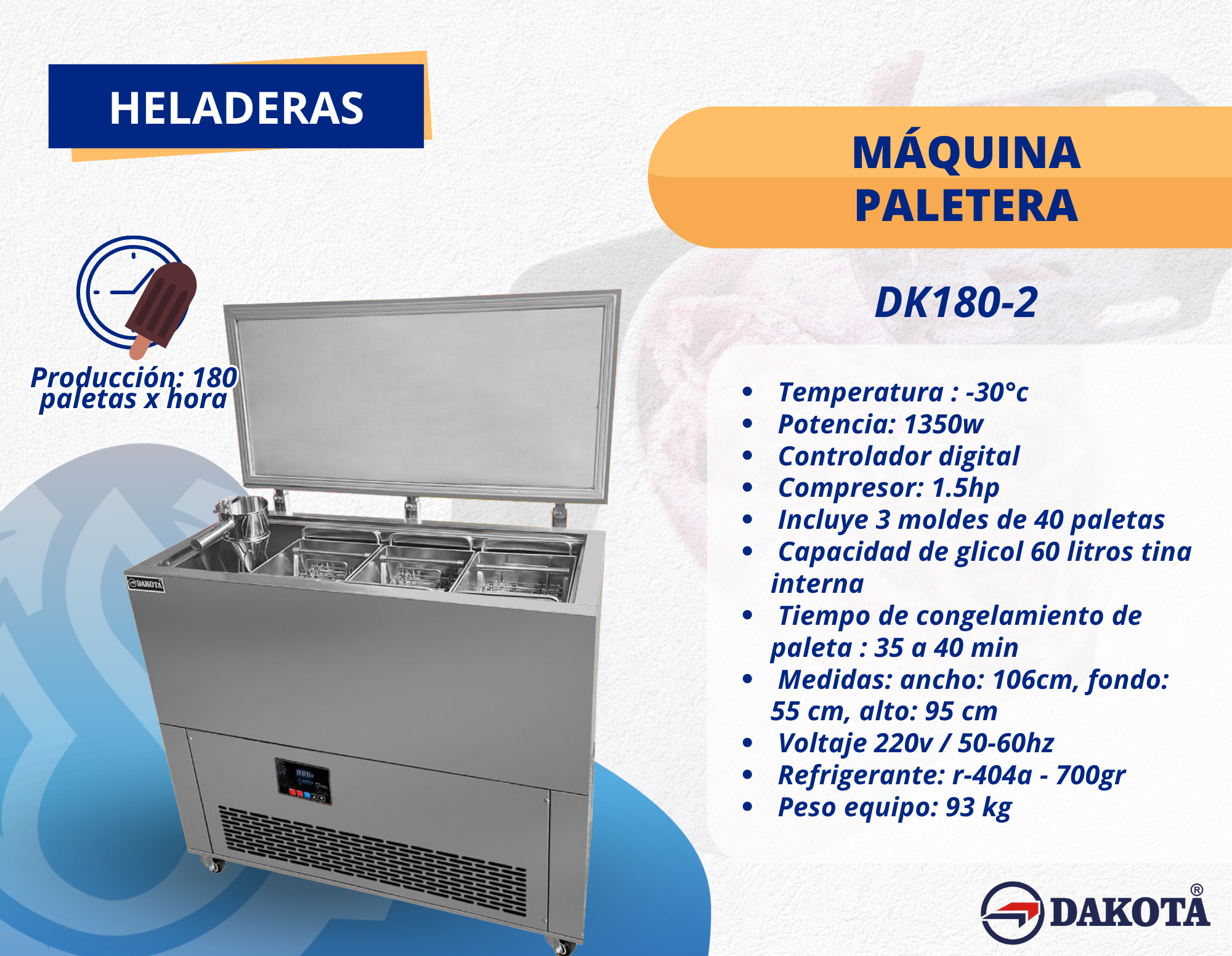 Incluye 3 moldes de 40 paletas y una tina interna de 60 L de glicol, con un tiempo de congelamiento de 35 a 40 min.