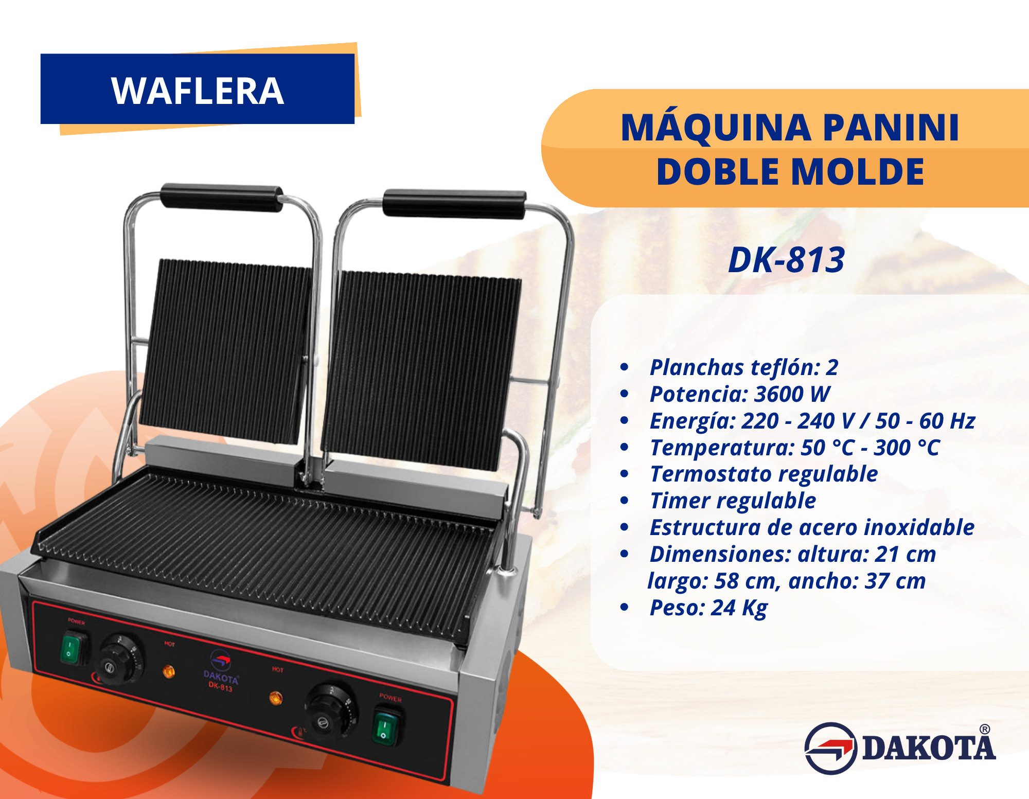Máquina Panini doble molde DK-813, ideal para preparar paninis, sándwiches, hamburguesas y alimentos a la parrilla de forma rápida y uniforme. Equipada con 2 planchas de teflón antiadherente, potencia de 3600 W y control de temperatura ajustable de 50°C a 300°C con termostato y timer regulables. Su estructura de acero inoxidable ofrece resistencia, durabilidad y fácil limpieza. Perfecta para cafeterías, restaurantes y negocios de comida rápida.