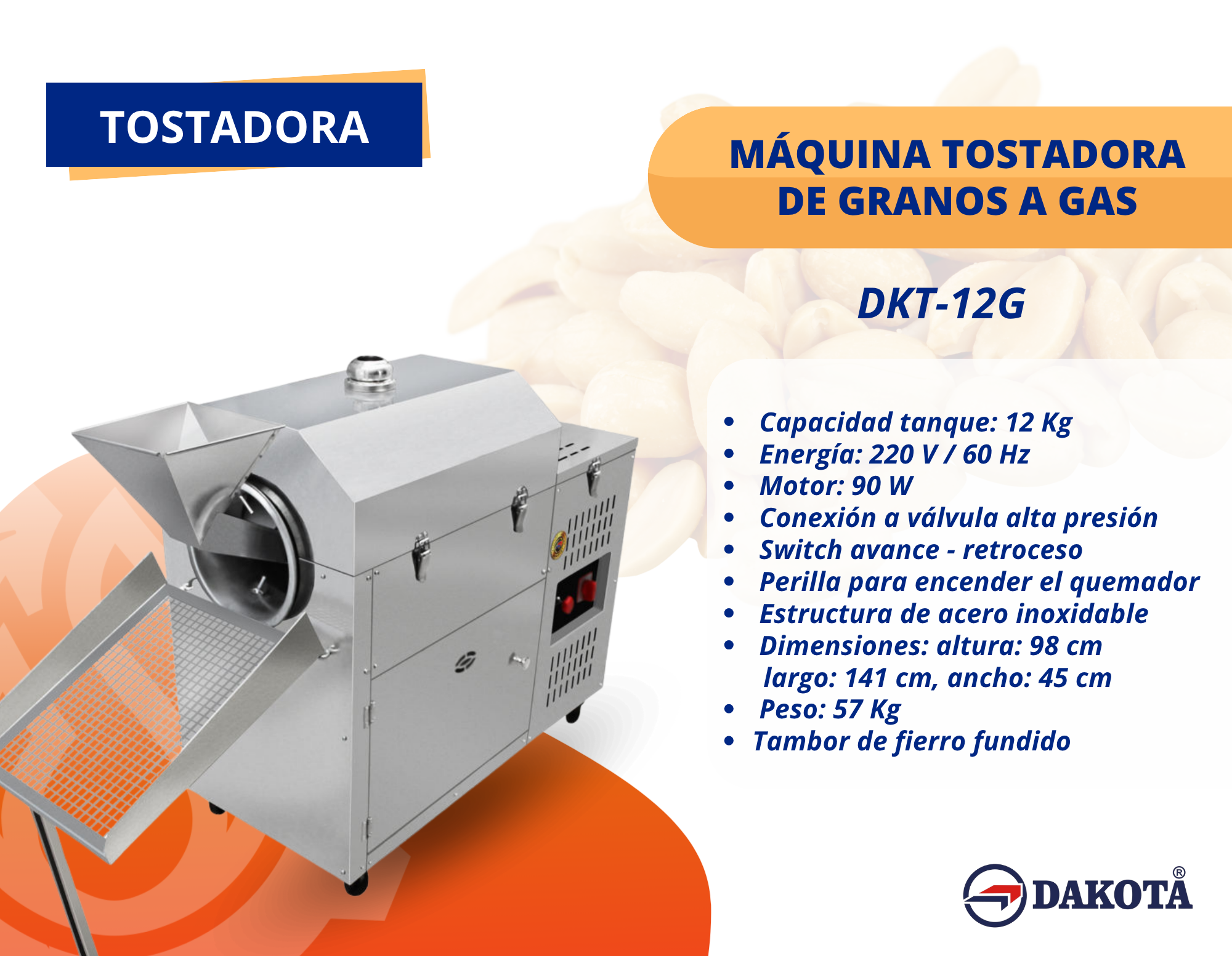 La Máquina Tostadora de Granos a Gas DKT-12G es perfecta para tostar café, maní, maíz y otros granos de forma rápida y homogénea. Su tanque de 12 kg, motor de 90 W y tambor de fierro fundido garantizan un rendimiento eficiente y duradero. Funciona con gas de alta presión, incluye perilla de encendido del quemador y sistema de avance y retroceso para un control total del proceso. Fabricada en acero inoxidable, combina potencia, resistencia y fácil mantenimiento, ideal para negocios de alimentos o tostadores profesionales.