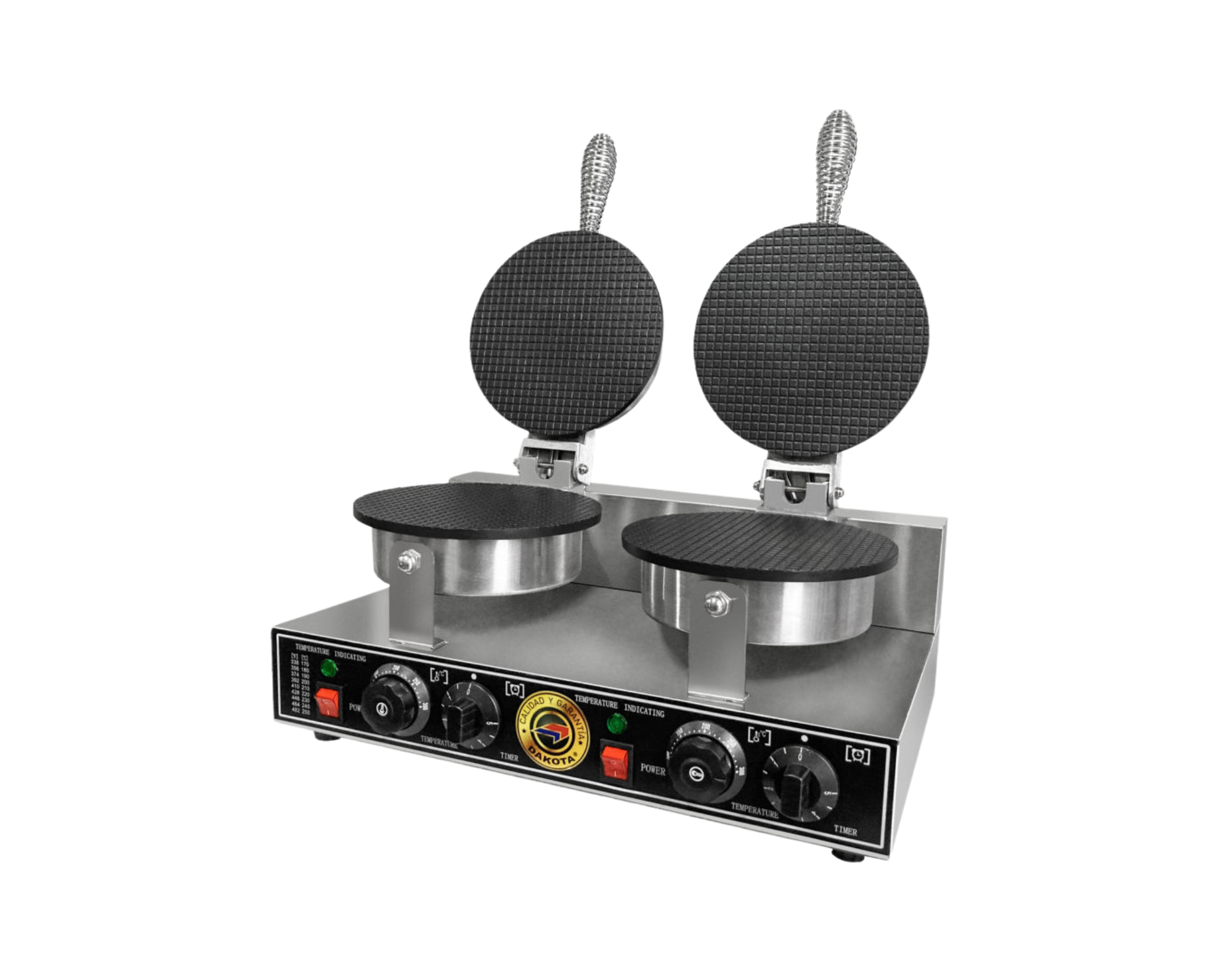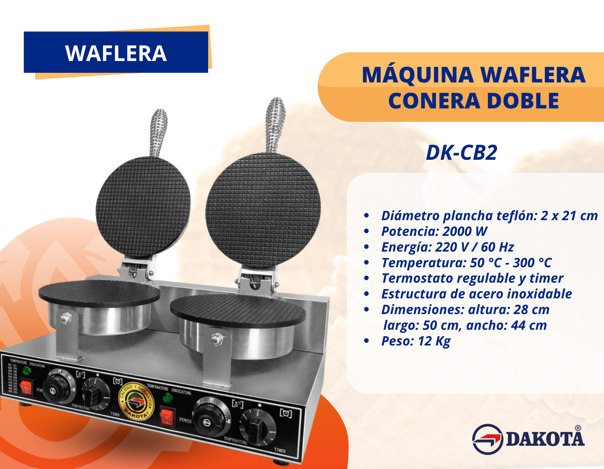 Máquina waflera doble profesional, ideal para preparar waffles tipo cono y postres crujientes de forma rápida y uniforme. Cuenta con 2 planchas de teflón de 21 cm, potencia de 2000 W y control de temperatura de 50°C a 300°C con termostato regulable y timer. Su estructura de acero inoxidable ofrece resistencia y fácil limpieza. Perfecta para cafeterías, heladerías y negocios de repostería.