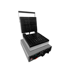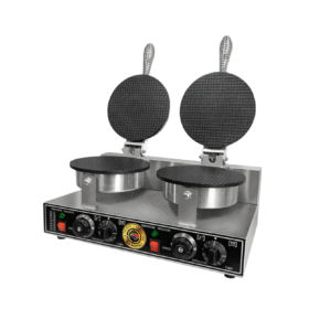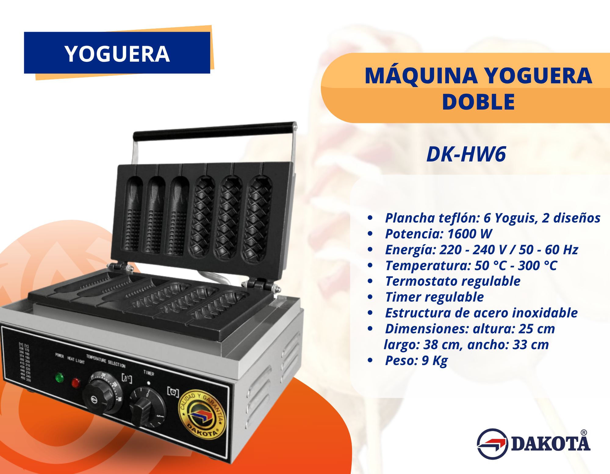 Máquina yoguera doble profesional, ideal para preparar yoguis o mini waffles con 2 diseños diferentes. Cuenta con plancha de teflón para 6 unidades, potencia de 1600 W y control de temperatura ajustable de 50°C a 300°C. Incorpora termostato y timer regulables para una cocción precisa. Su estructura de acero inoxidable ofrece durabilidad, higiene y fácil limpieza. Perfecta para cafeterías, pastelerías y negocios de postres.