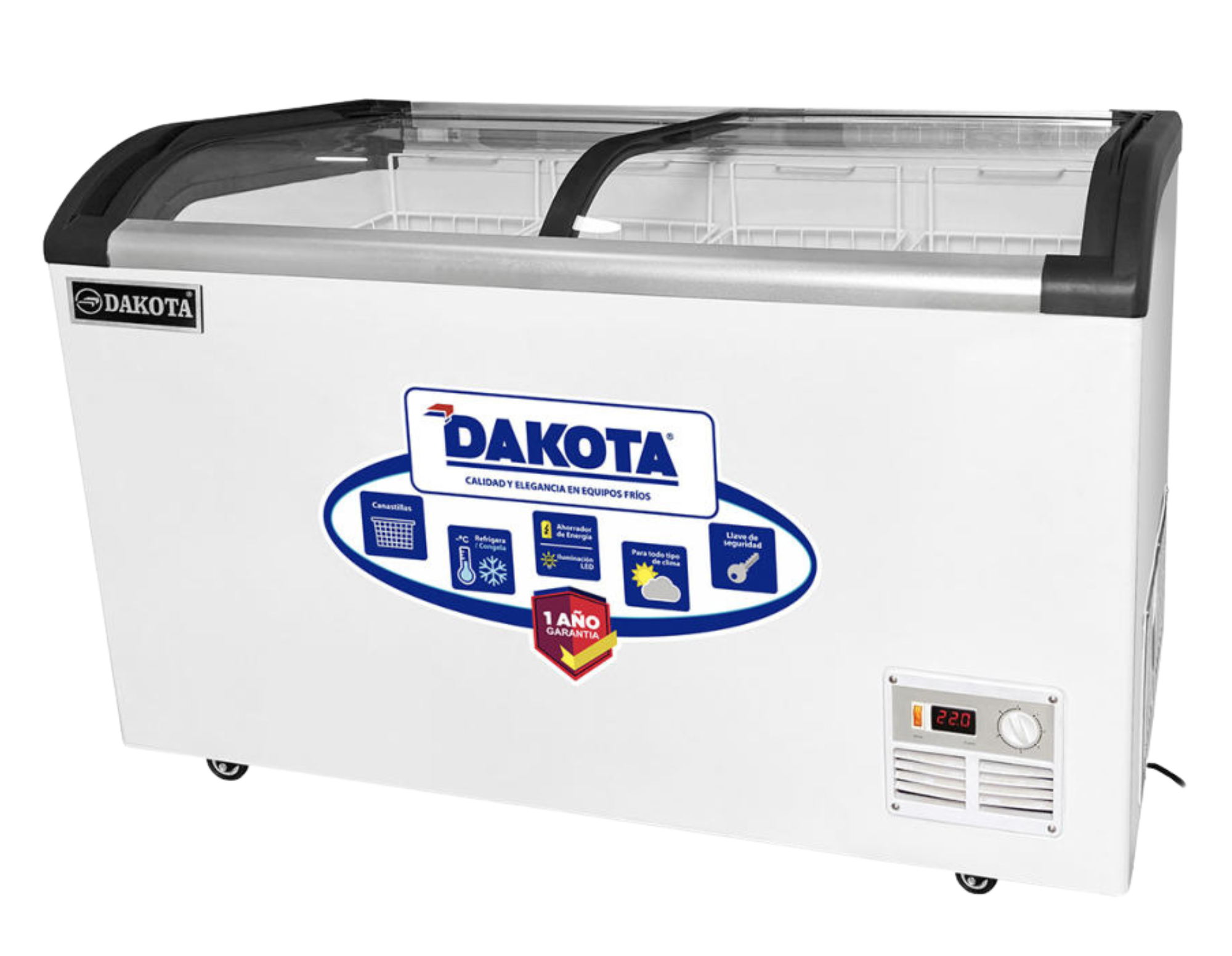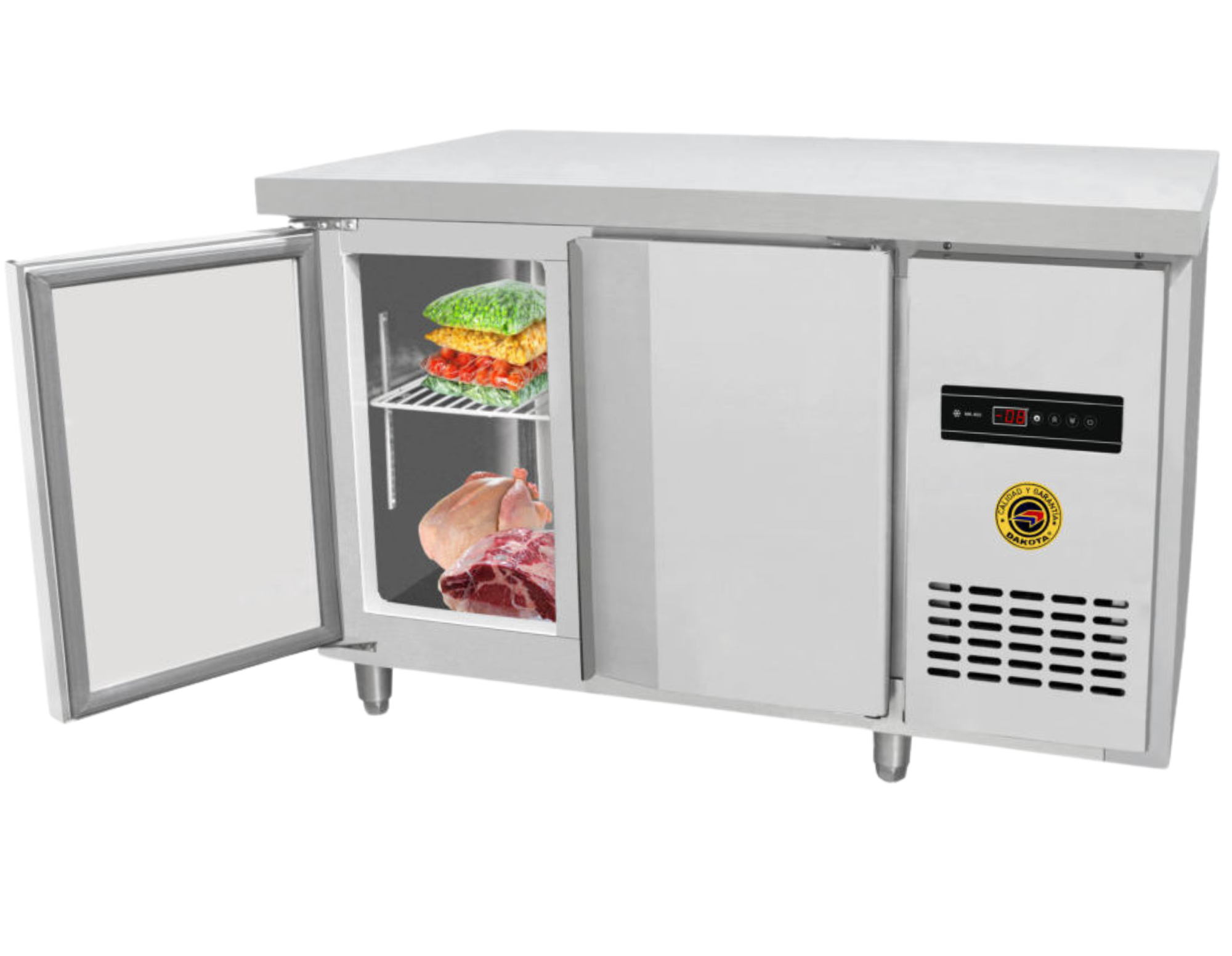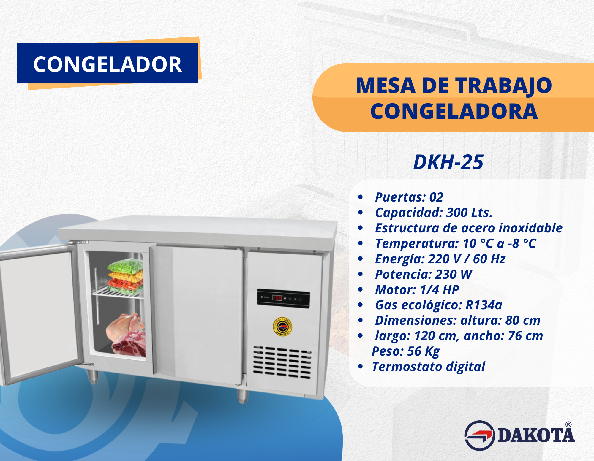 Mesa de Trabajo Congeladora de 300L – Dakota DKH-25, la congeladora de 300 litros Dakota DKH-25 combina superficie de trabajo en acero inoxidable y gran capacidad de conservación para bebidas, helados y alimentos. Su rango de 10 °C a -8 °C, motor de 1/4 HP, gas ecológico R134a y termostato digital aseguran eficiencia, frescura y durabilidad en negocios y cocinas profesionales.