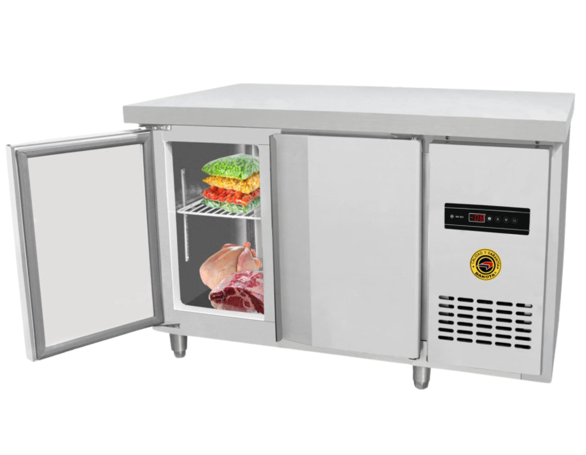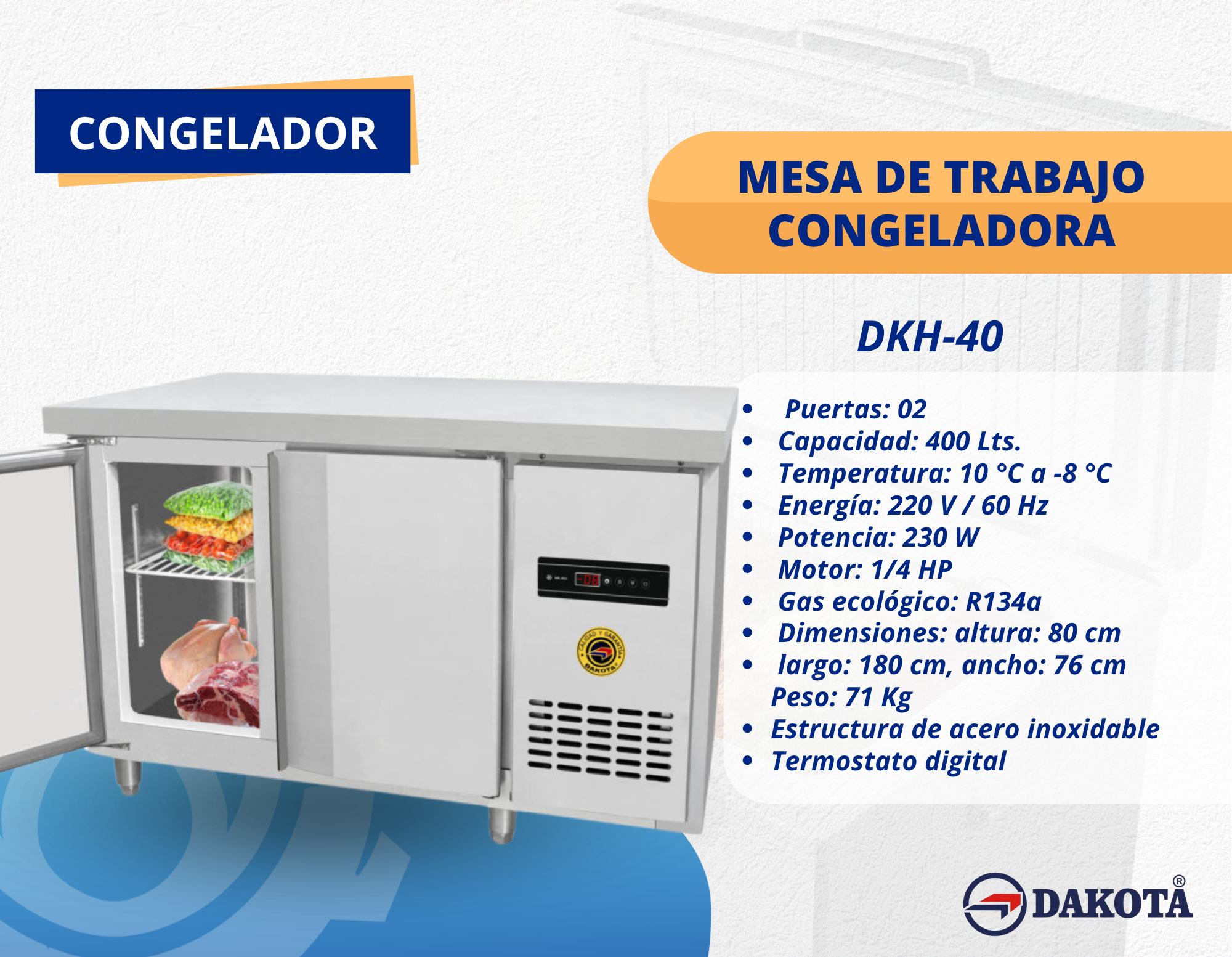 La congeladora de 400 litros Dakota DKH-40 combina gran capacidad y superficie de trabajo en acero inoxidable, ideal para negocios y cocinas profesionales. Con 2 puertas abatibles y rango de 10 °C a -8 °C, conserva bebidas, helados y alimentos con máxima frescura. Equipada con motor de 1/4 HP, gas ecológico R134a y termostato digital, ofrece eficiencia, durabilidad y bajo consumo, siendo la opción perfecta para restaurantes, hoteles y comercios.