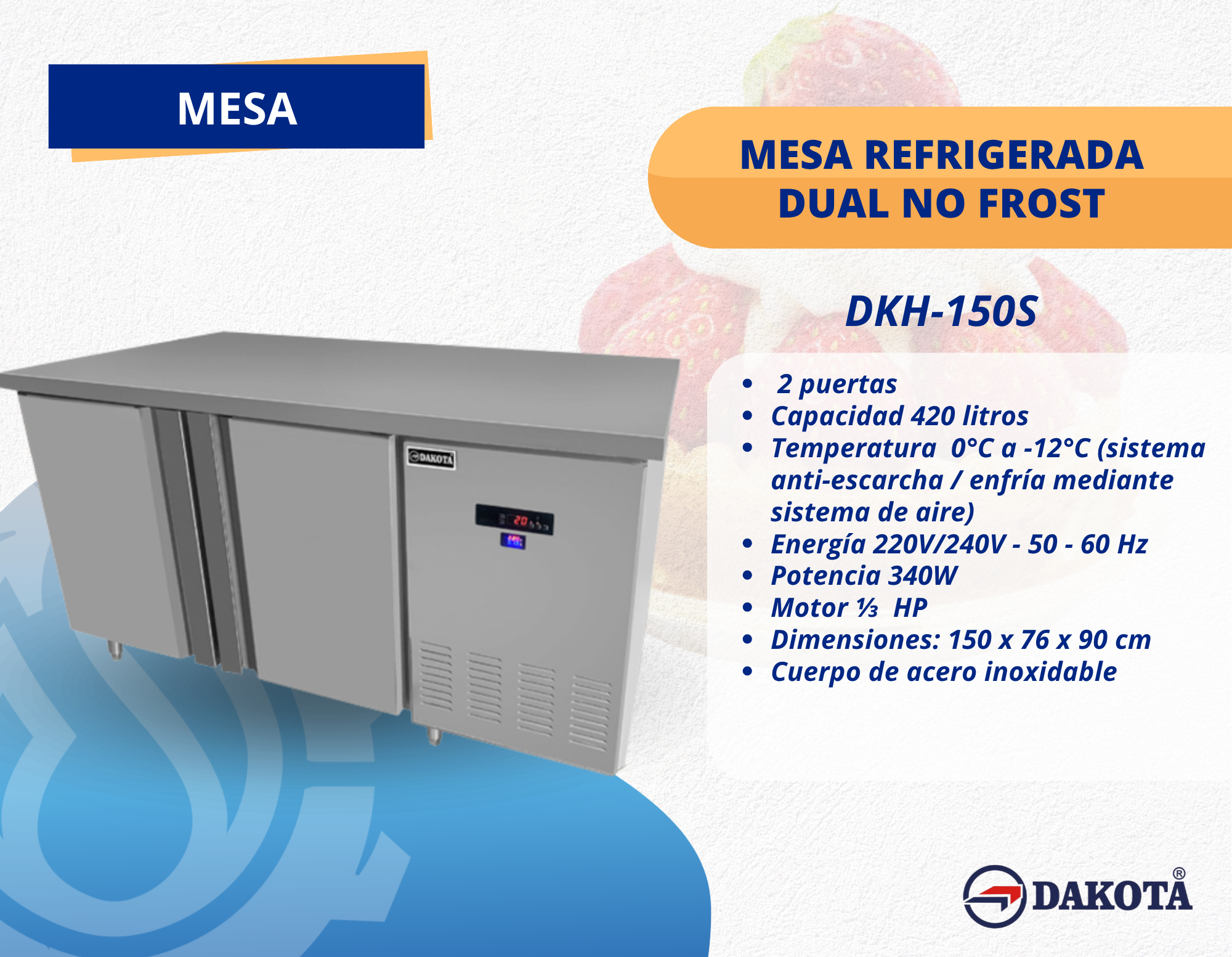 La mesa refrigerada dual No Frost DKH-150S ofrece eficiencia, potencia y conservación óptima gracias a su sistema anti-escarcha por aire. Con 2 puertas, capacidad de 420 litros y temperatura de 0°C a -12°C, mantiene los alimentos en perfectas condiciones. Fabricada en acero inoxidable, cuenta con motor de ⅓ HP, potencia de 340W y medidas de 150 x 76 x 90 cm, ideal para cocinas industriales y restaurantes.