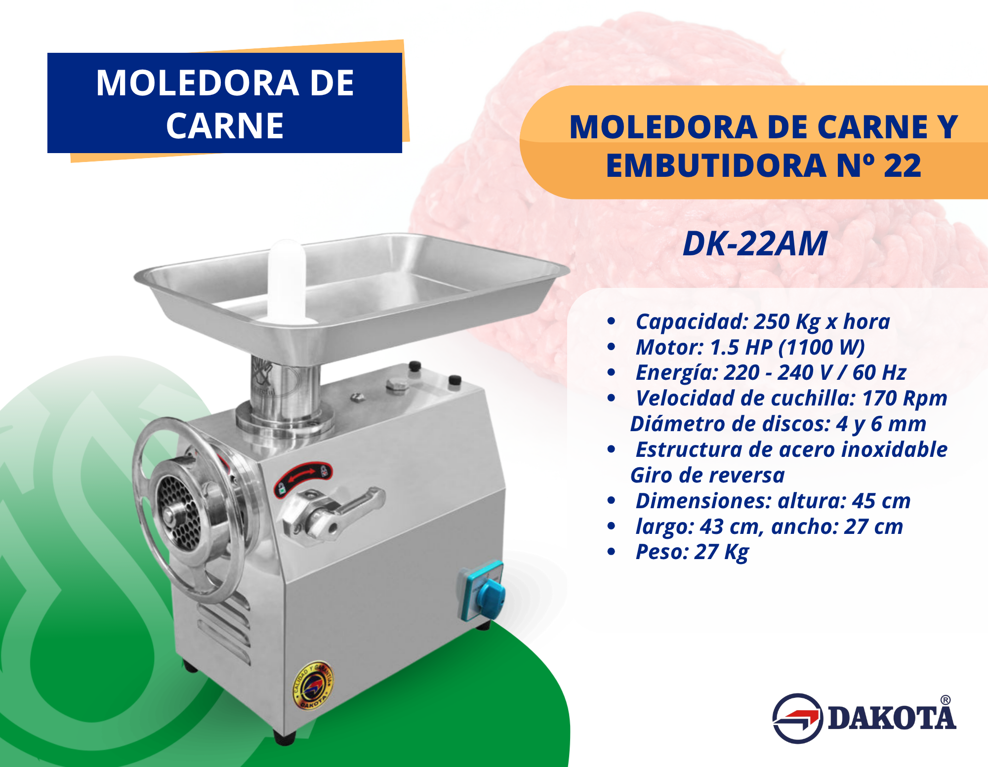 La Moledora de Carne y Embutidora Nº 22 – DK-22AM es una máquina industrial de alto rendimiento, ideal para carnicerías, restaurantes y negocios que requieren una producción constante y eficiente. Con una capacidad de 250 kg por hora y un motor de 1.5 HP, garantiza potencia, velocidad y resultados uniformes. Su estructura de acero inoxidable asegura durabilidad, fácil limpieza e higiene en todo el proceso. Incluye discos de 4 mm y 6 mm para distintos tipos de molienda, además de sistema de giro de reversa que evita atascos y mejora la eficiencia del trabajo.