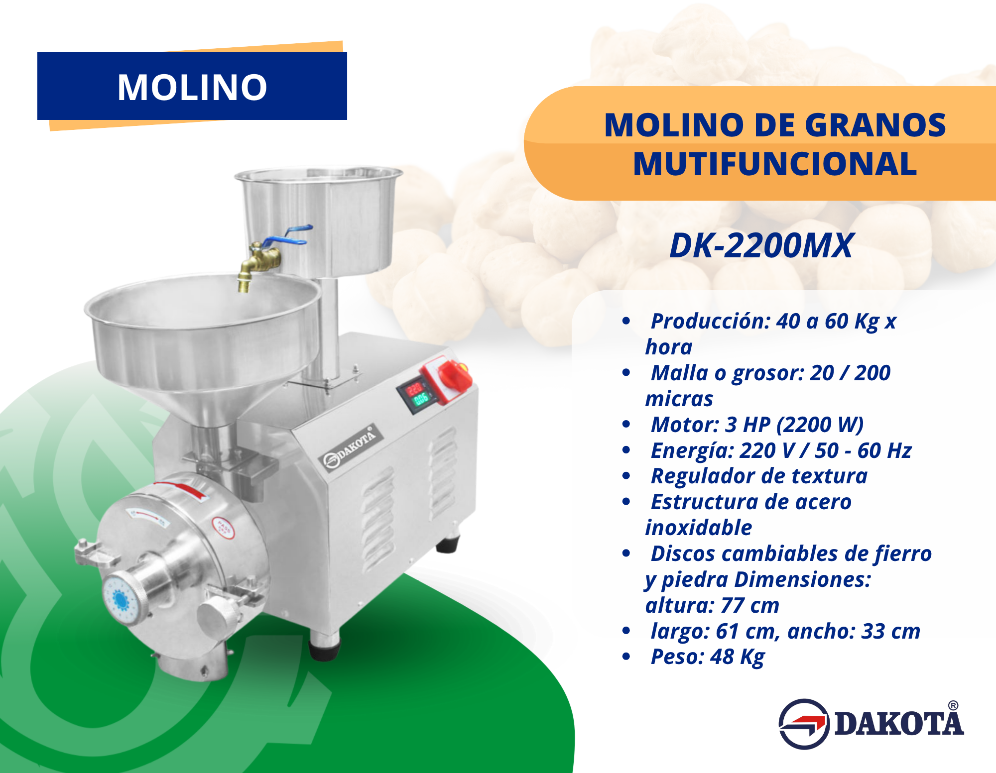 El Molino de Granos Multifuncional DK-2200MX está diseñado para quienes buscan máxima versatilidad y rendimiento en el procesamiento de granos. Con una capacidad de 40 a 60 kg por hora, es ideal para molinerías, negocios agrícolas, panaderías, cafeterías y plantas de producción que requieren un equipo robusto y adaptable.