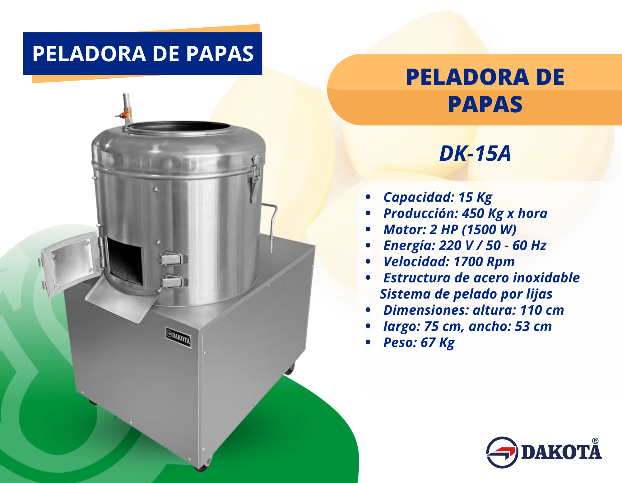La peladora de papas DK-15A combina potencia y capacidad industrial para agilizar la producción en cocinas profesionales. Con capacidad de 15 kg y rendimiento de hasta 450 kg por hora, su motor de 2 HP (1500 W) y velocidad de 1700 rpm garantizan un pelado rápido, uniforme y sin esfuerzo. Fabricada en acero inoxidable de alta durabilidad, utiliza un sistema de pelado por lijas que preserva la calidad del producto. Sus dimensiones son 110 x 75 x 53 cm y pesa 67 kg, ideal para restaurantes, hoteles y servicios de catering.