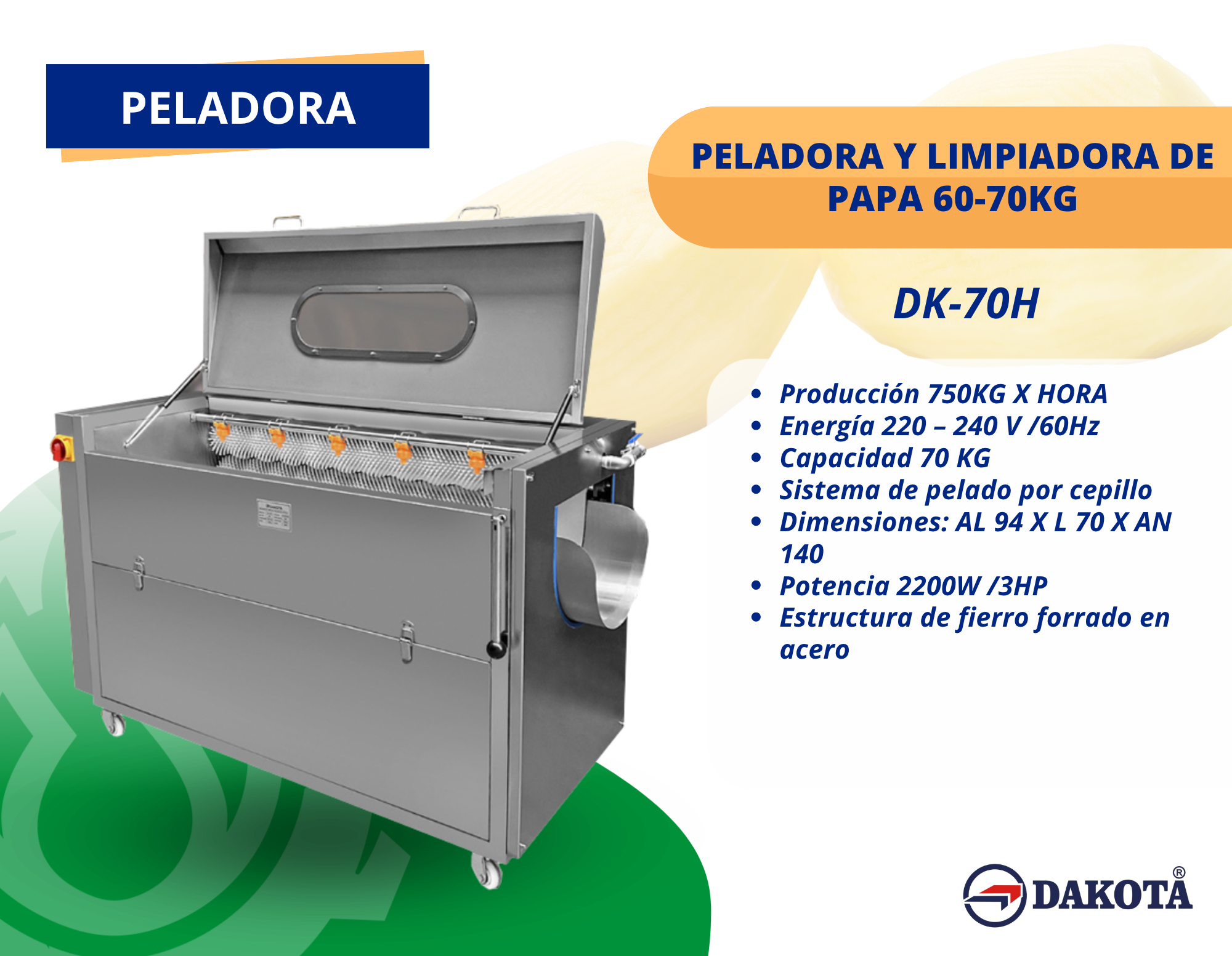La Peladora y Limpiadora Industrial de Papas DK-70H es una solución de alta capacidad para cocinas y plantas de procesamiento, con una impresionante producción de $750\text{ Kg/hora}$. Esta máquina opera con un eficiente sistema de pelado por cepillo y tiene una capacidad de carga de $70\text{ Kg}$. Su robusta estructura de fierro forrado en acero asegura durabilidad, mientras que su potente motor de $2200\text{ W / 3HP}$ (funcionando a $220-240\text{ V}/60\text{Hz}$) garantiza un rendimiento constante. Ideal para ahorrar tiempo y optimizar la preparación de grandes volúmenes de papa.