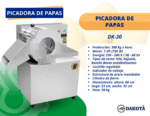 La picadora de papas DK-30 es ideal para procesar grandes volúmenes de papas de forma rápida y uniforme. Con una producción de hasta 300 kg por hora y un motor de 1 HP (750 W), ofrece rendimiento y precisión en cada corte. Permite realizar tres tipos de corte: hilo, hojuela y bastón, gracias a su cuchilla regulable. Su estructura de acero inoxidable y cilindro de fierro garantizan durabilidad y fácil limpieza. Además, cuenta con bases antideslizantes e indicador de voltaje para mayor seguridad.