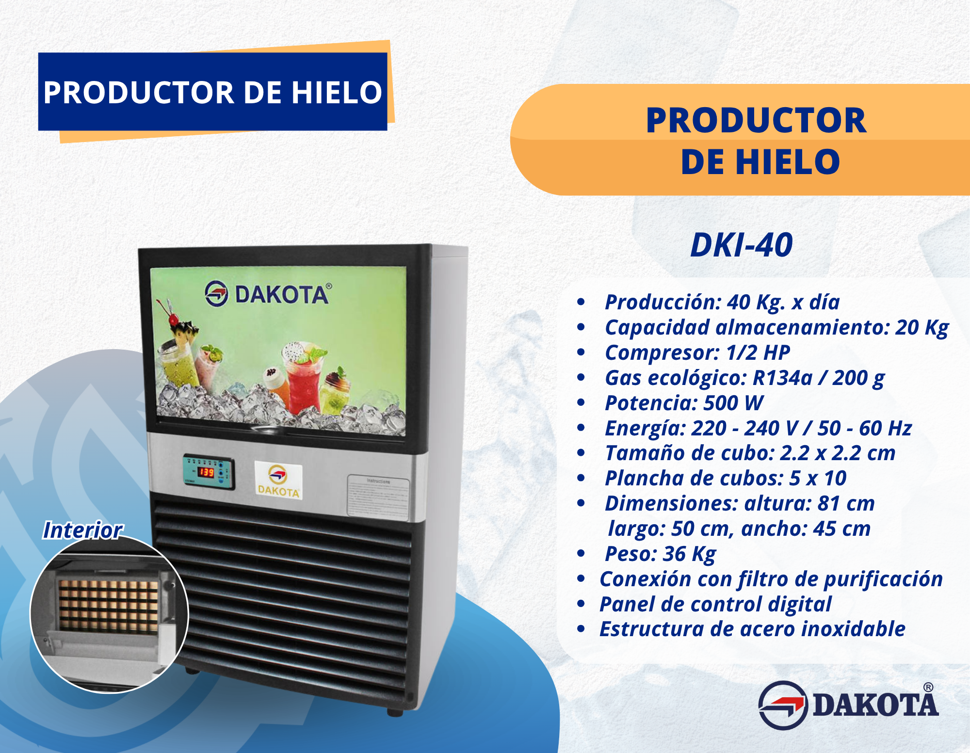 Produce hasta 40 kg de hielo al día con una capacidad de almacenamiento de 20 kg, ideal para restaurantes, bares, hoteles y cafeterías. Su estructura de acero inoxidable garantiza durabilidad e higiene. Incorpora panel de control digital, compresor de 1/2 HP y sistema de purificación de agua para obtener cubos uniformes de 2.2 x 2.2 cm.