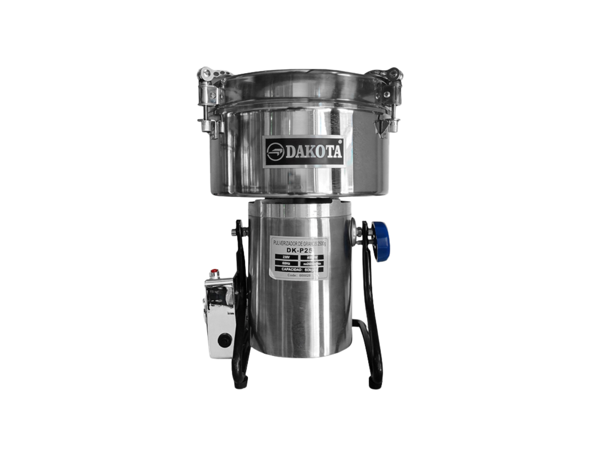 El Pulverizador de Granos Secos DK-P25 es una máquina de alto rendimiento diseñada para la molienda rápida y eficiente de granos, semillas y especias. Con una impresionante potencia de 5000 W y operando a 220V – 230 V, alcanza una producción de hasta 60 Kg por hora. Su contenedor de 2.5 KG y su estructura integral en acero inoxidable (incluyendo las cuchillas) garantizan durabilidad e higiene. Además, incorpora un regulador que permite volcar el contenedor, facilitando la descarga y el manejo del producto pulverizado.