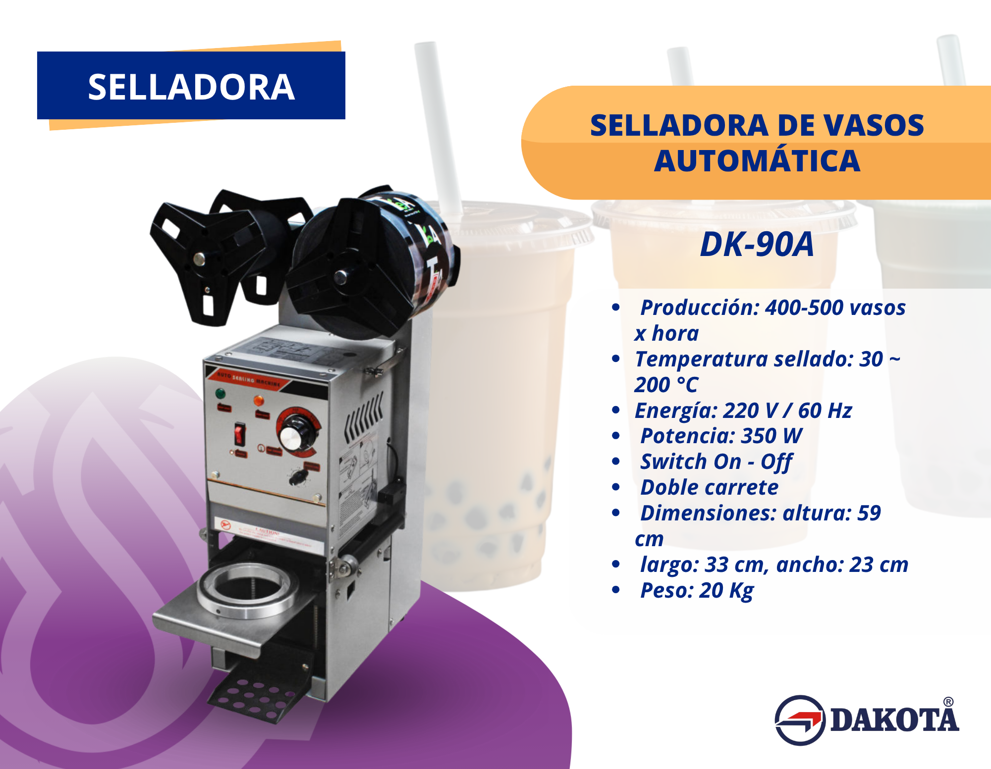 La Selladora de Vasos Automática DK-90A ofrece un rendimiento superior para negocios que requieren rapidez, precisión y un sellado totalmente profesional. Con una capacidad de 400 a 500 vasos por hora, esta máquina permite atender una alta demanda sin interrupciones.