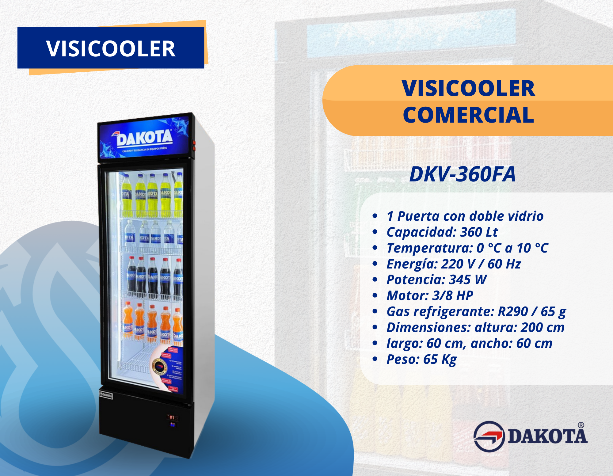 Visicooler Comercial de 460L de Dakota DKV-460FA, Conserva y exhibe bebidas, helados y alimentos refrigerados con este visicooler de 460 litros con puerta de marco de aluminio. Opera entre 0°C y 10°C, con motor 1/3 HP, potencia de 300 W y refrigerante R290, asegurando frescura y eficiencia. Con iluminación LED y diseño robusto (200x65x65 cm, 85 kg), es la opción ideal en exhibidores y congeladores comerciales para tu negocio.