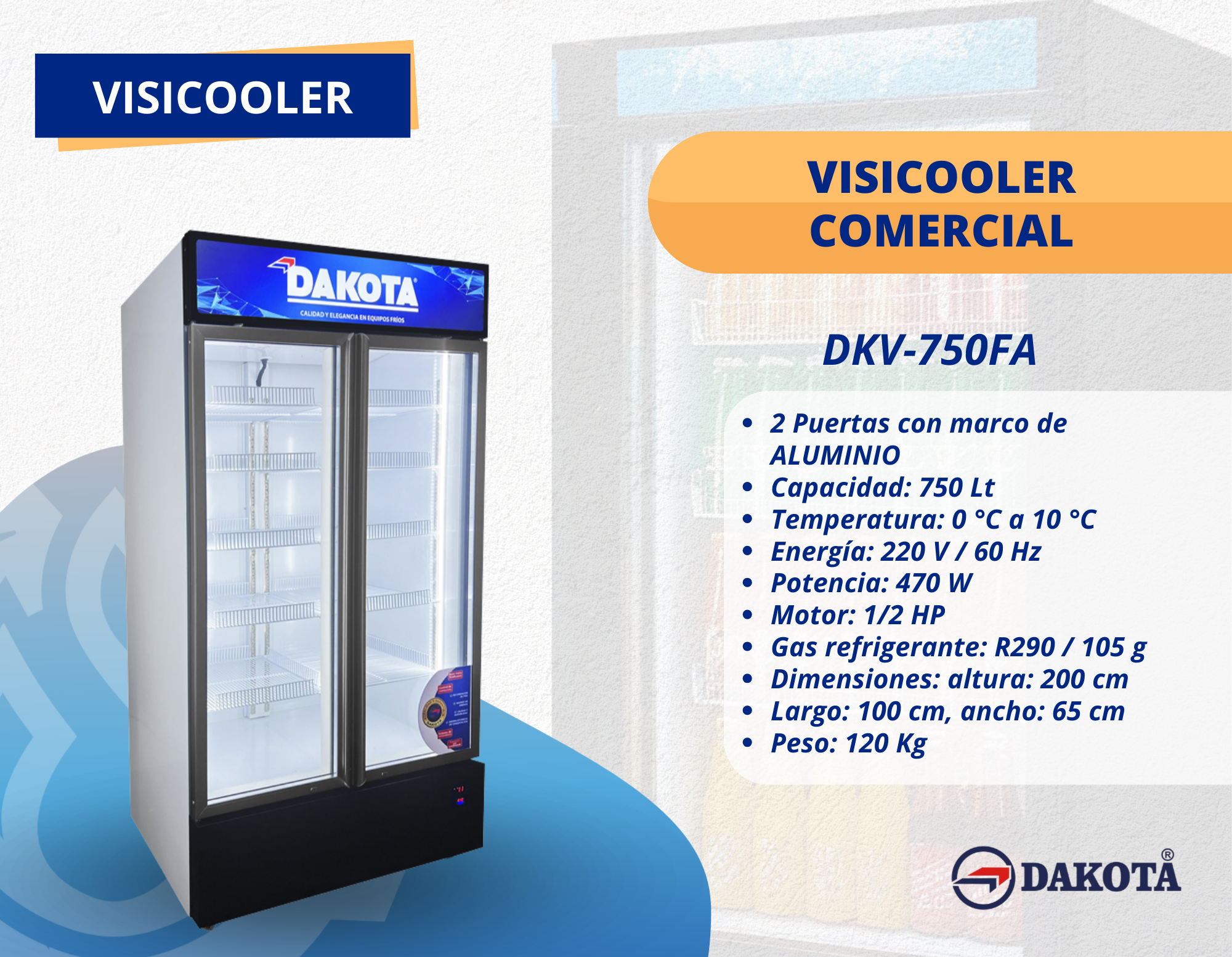 Visicooler Comercial de 750L – Dakota DKV-750FA, perfecto para bebidas, cervezas, helados y alimentos refrigerados, este visicooler de 750 litros con 2 puertas de aluminio, motor 1/2 HP y refrigerante R290 ofrece máxima eficiencia y durabilidad. Con iluminación LED, amplio espacio (200x100x65 cm, 120 kg) y temperatura regulable de 0 °C a 10 °C, es ideal en exhibidores y congeladores comerciales para negocios de alto volumen.