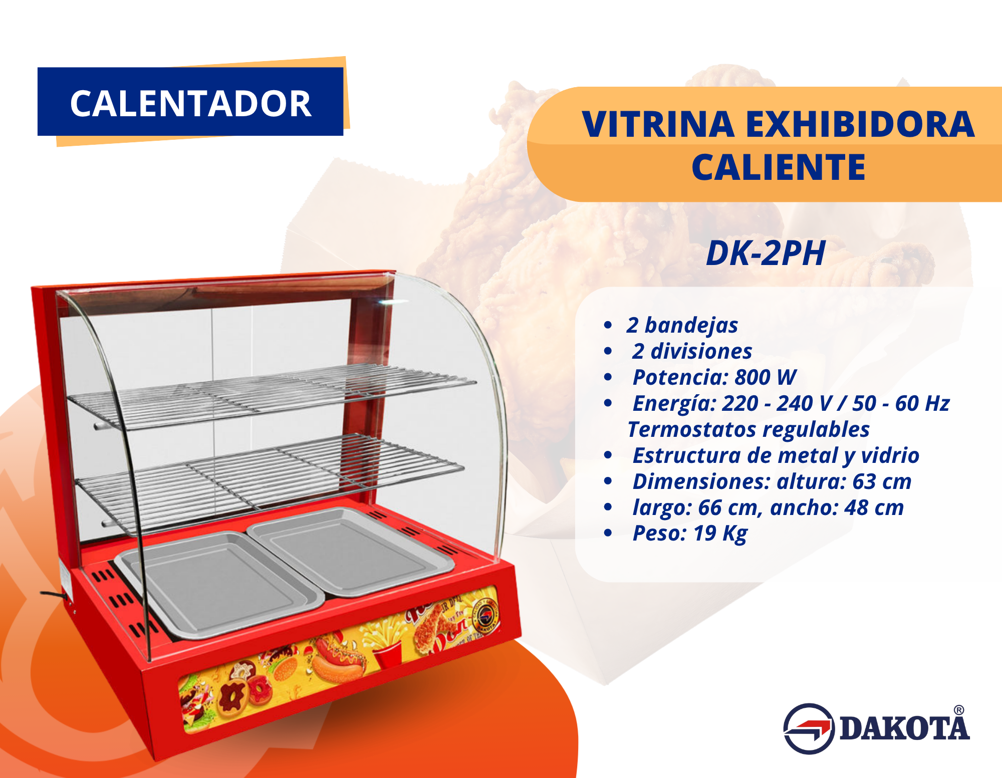 La Vitrina Exhibidora Caliente DK-2PH con 2 bandejas y 2 divisiones es ideal para mantener y exhibir alimentos calientes en óptimas condiciones. Con una potencia de 800 W y termostatos regulables, garantiza una temperatura uniforme y controlada. Su estructura de metal y vidrio resistente ofrece durabilidad y una excelente visibilidad del producto. Con dimensiones de 63x66x48 cm y peso de 19 kg, es perfecta para panaderías, cafeterías, restaurantes y negocios de comida rápida.